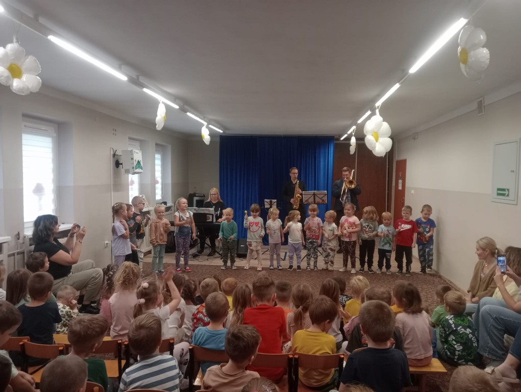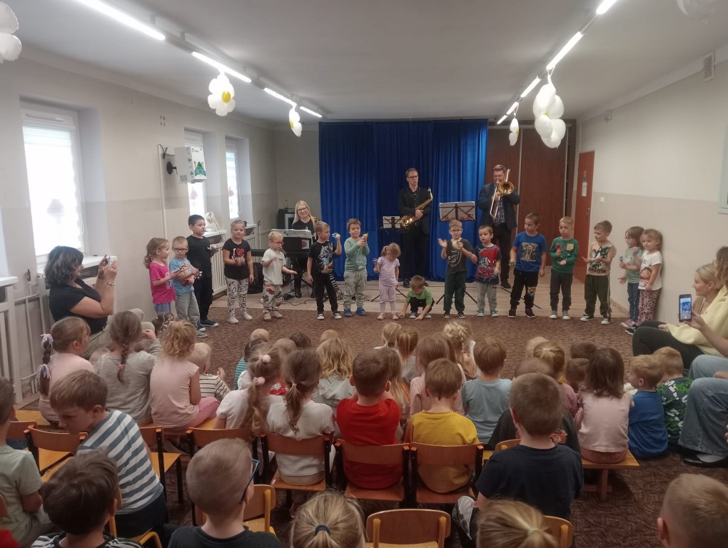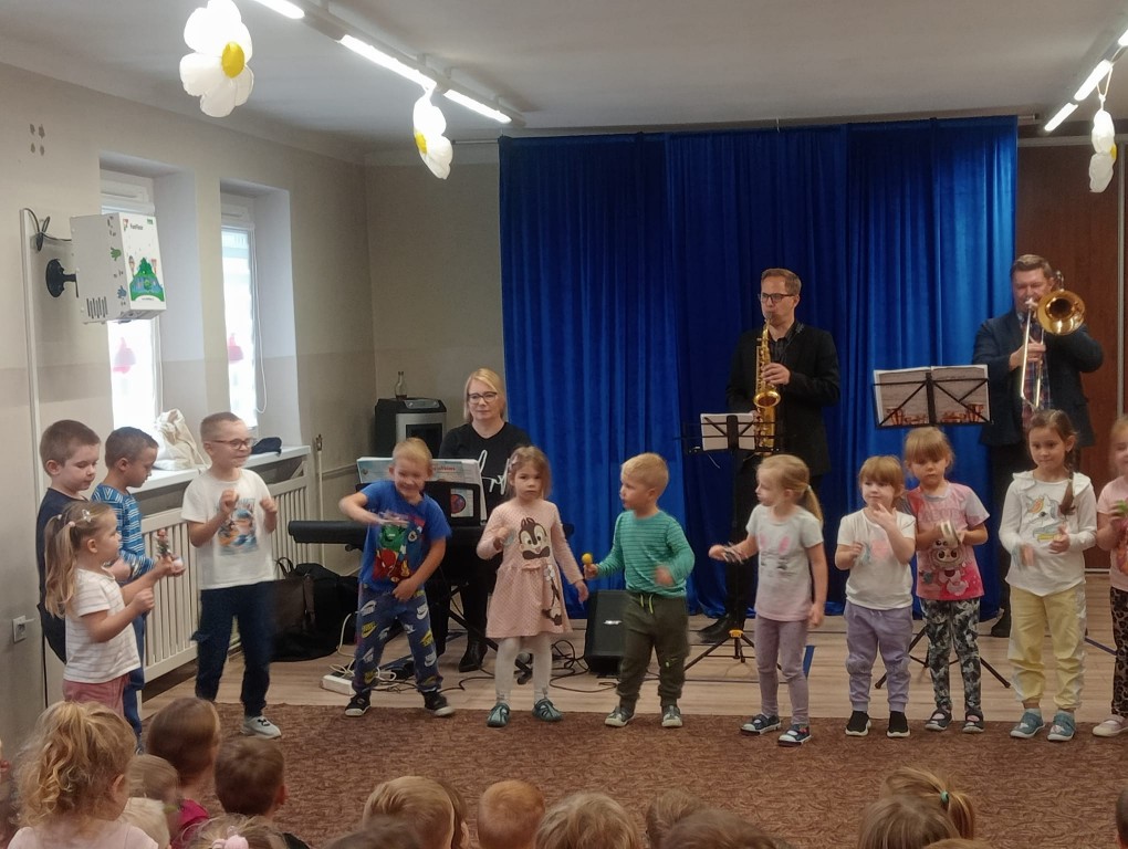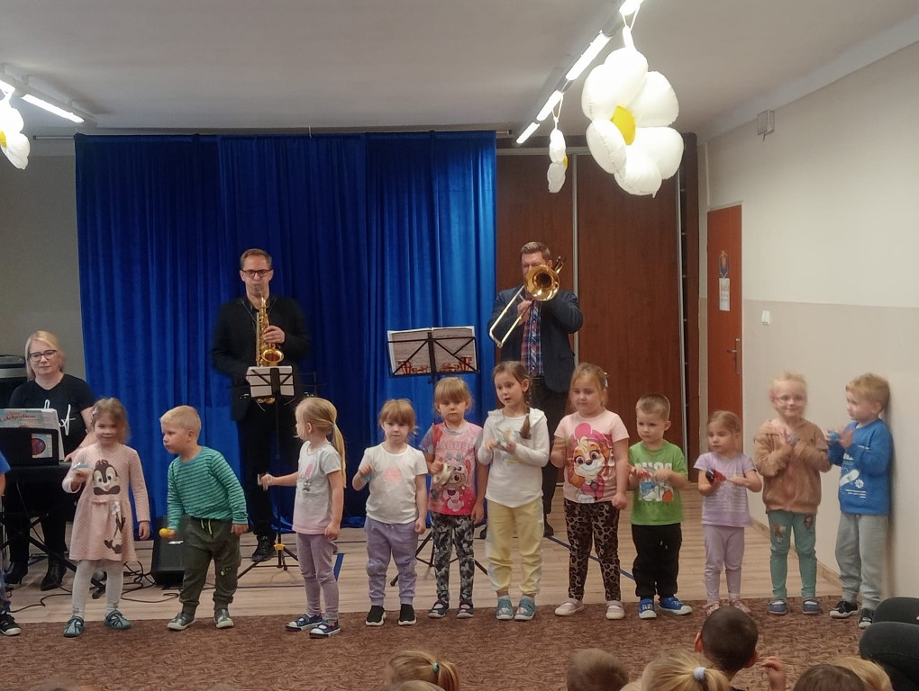 W pierwszy listopadowy poniedziałek nasze Przedszkolaki miały niezwykłe spotkanie z muzykami. Zaproszeni muzycy zaprezentowali: trąbkę, puzon i keyboard pokazali swoje instrumenty oraz zagrali przy akompaniamencie naszych milusińskich melodie z bajek Disneya. To był bardzo wesoły i ubogacajacy czas.